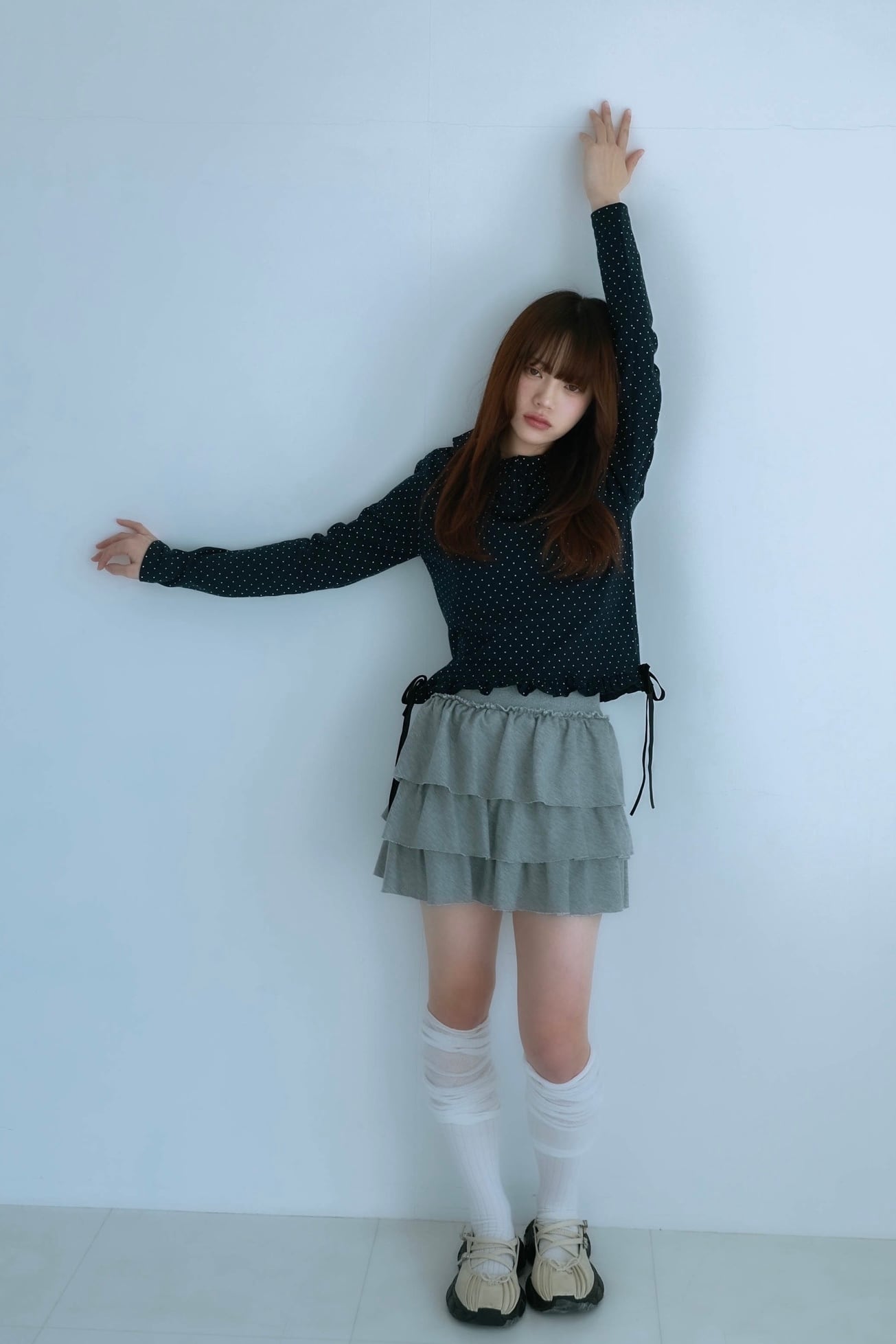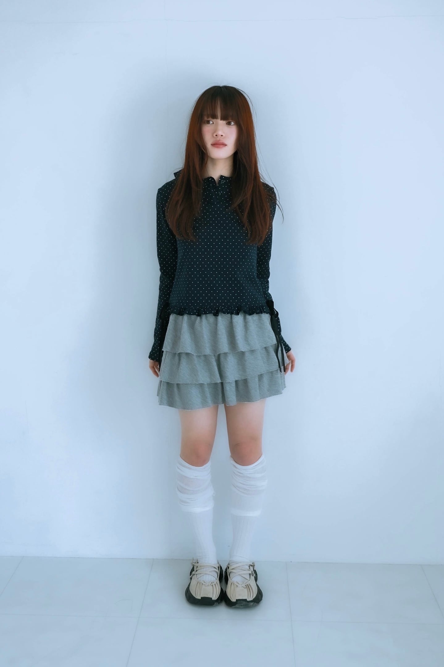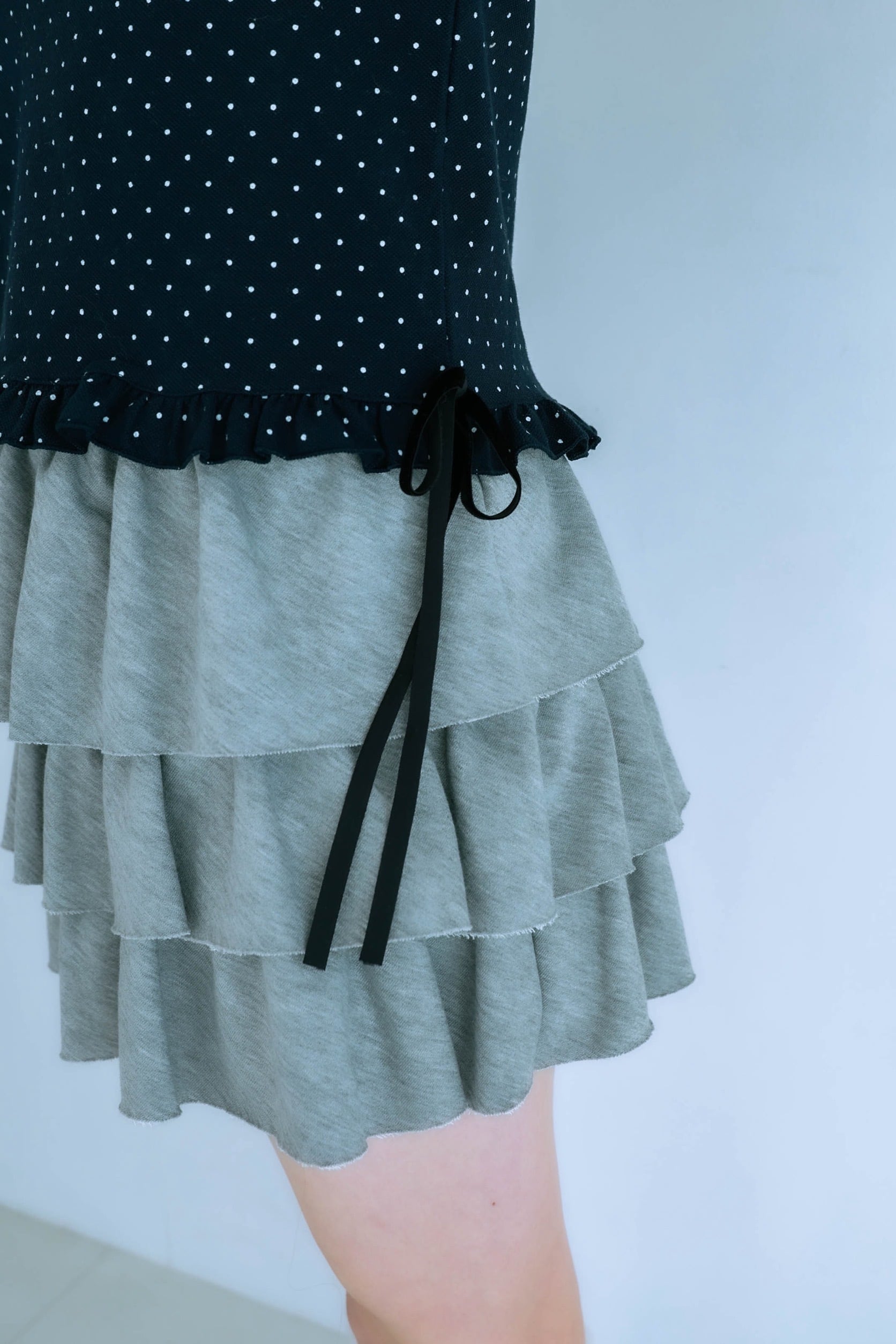 裾フリルとサイドのリボンがポイントのドットフリルT●。.·