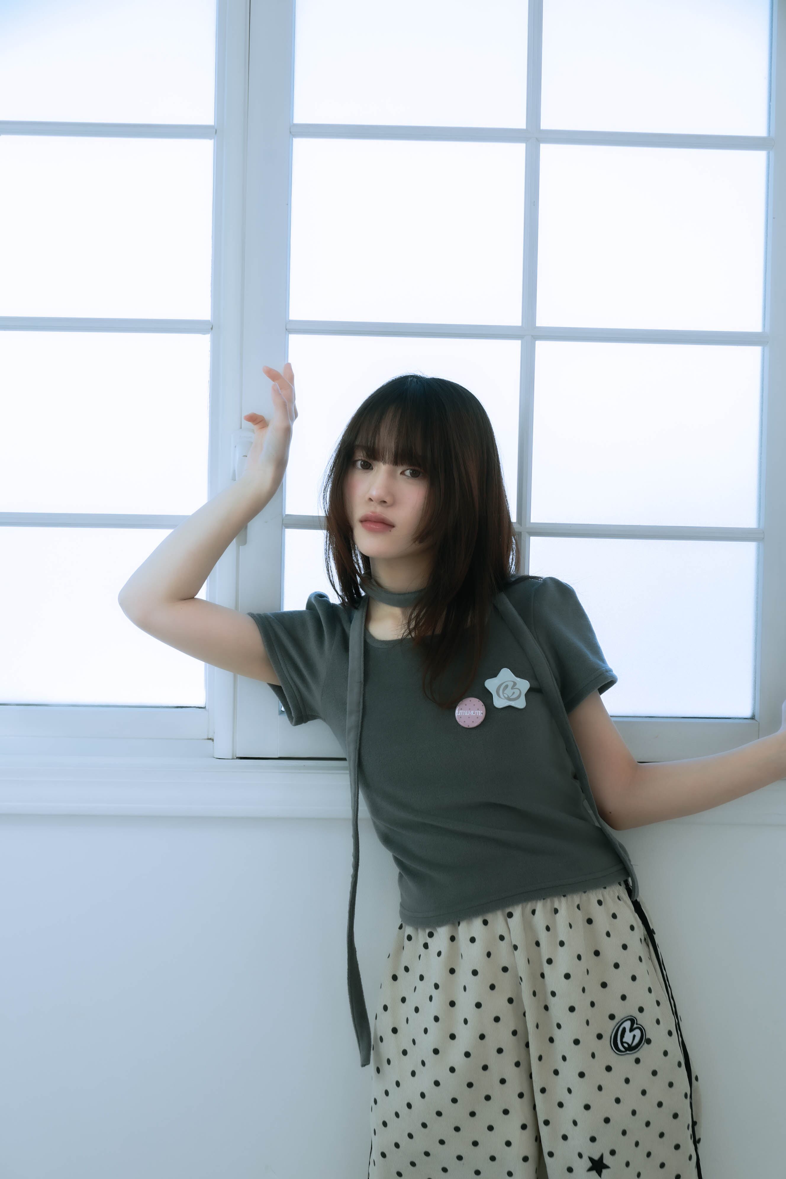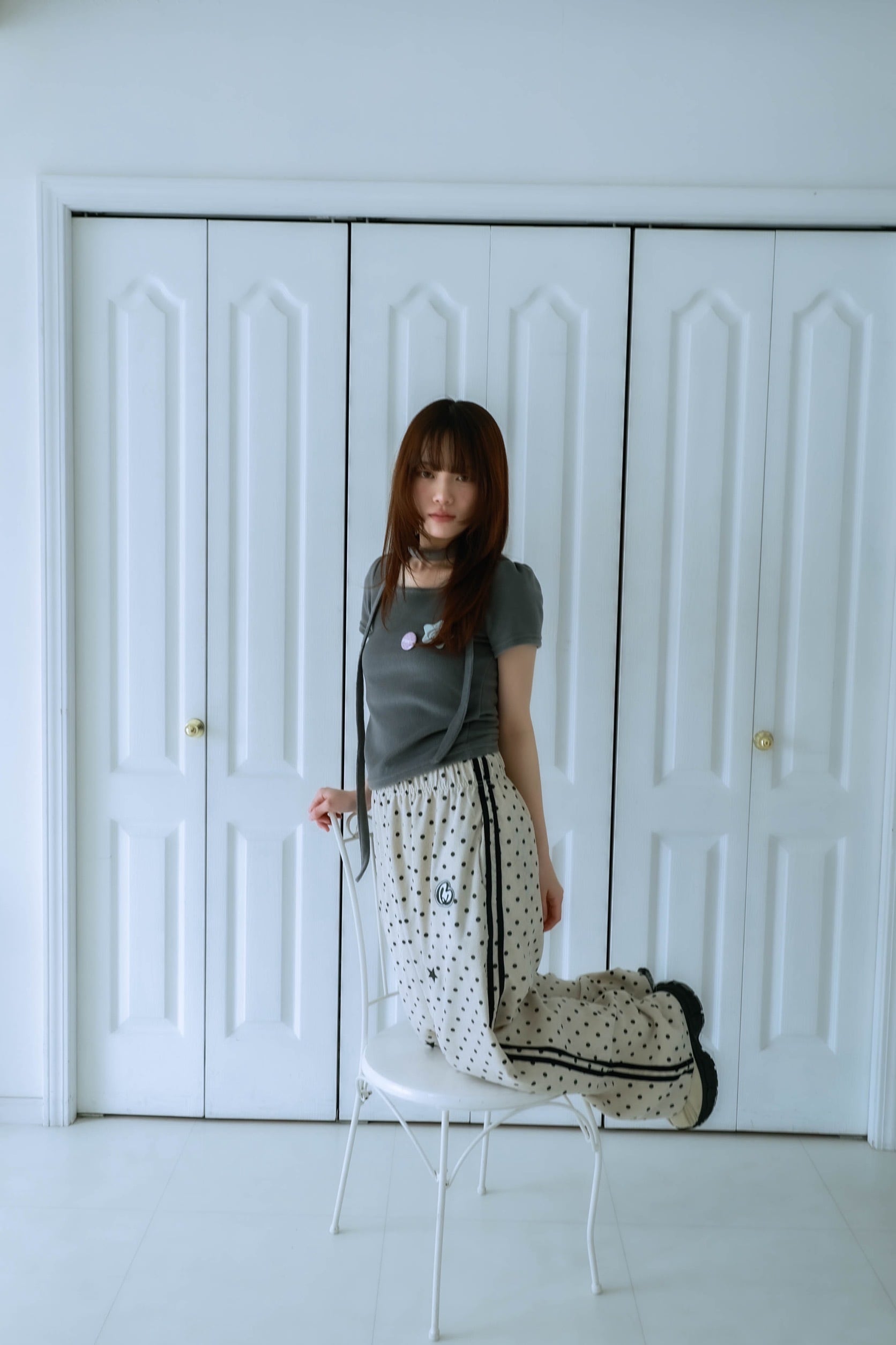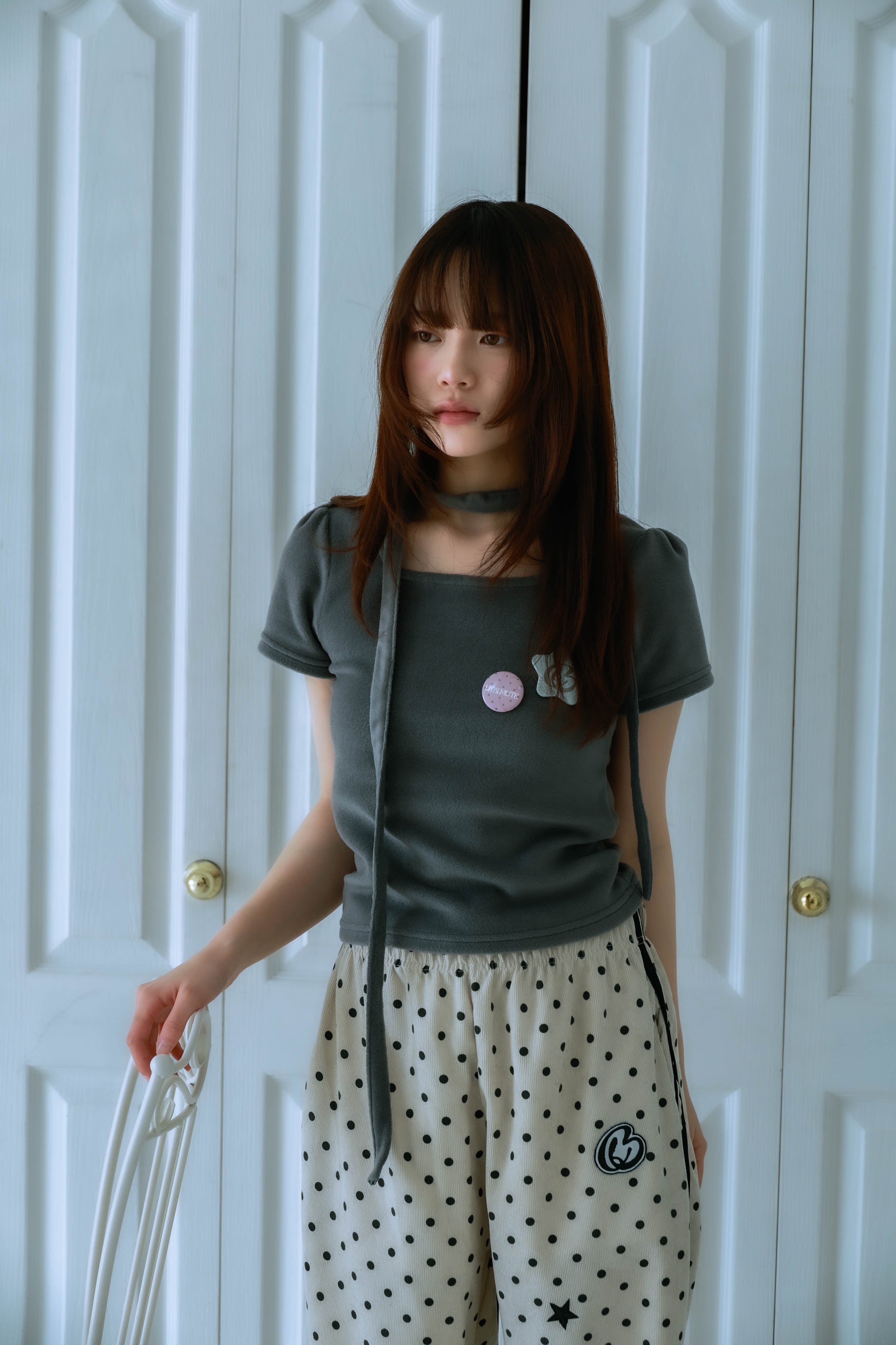 ピンクドットと水色スターのロゴ缶バッジがポイントのchoker badge tee•*¨*•.¸¸♬︎
