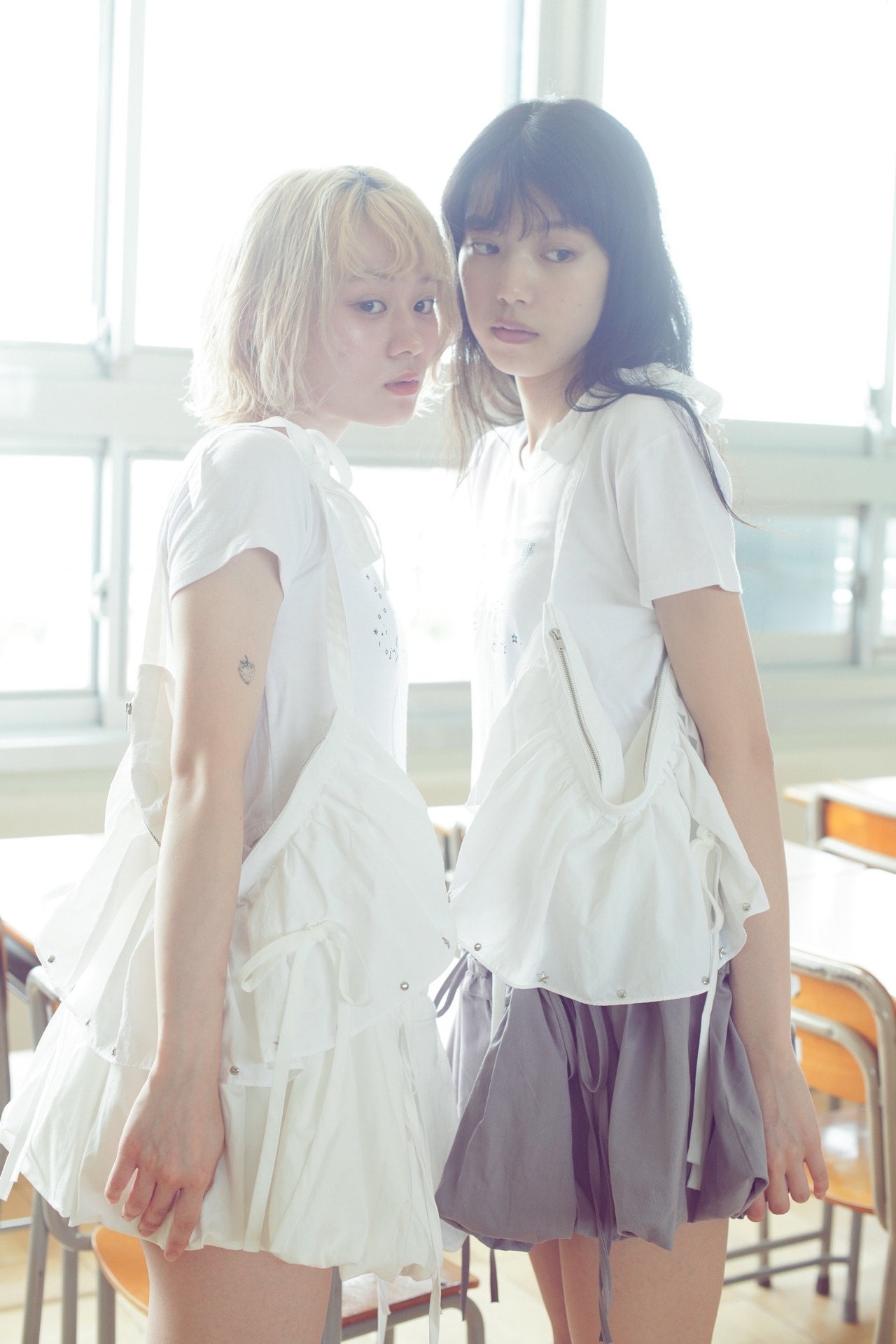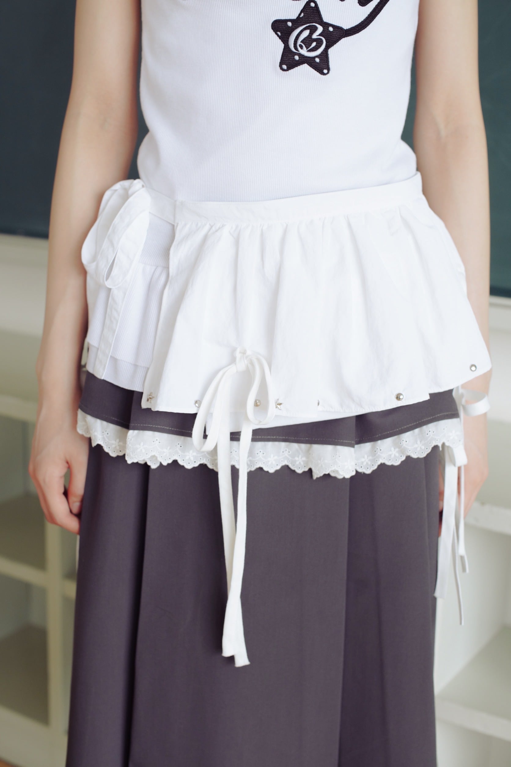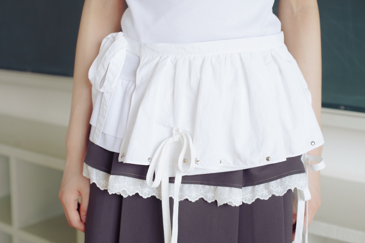 丸や星のスタッズや垂れ下がるリボンなどの遊び心あるディティールが散らばるレイヤードスカート⟡.·他のアイテムと合わせてレイヤードしたり、小物を入れてウエストバッグとして、持ち手を調整し肩にかけてバッグとしてなど、シーンに合わせて使い方は自由自在です♩