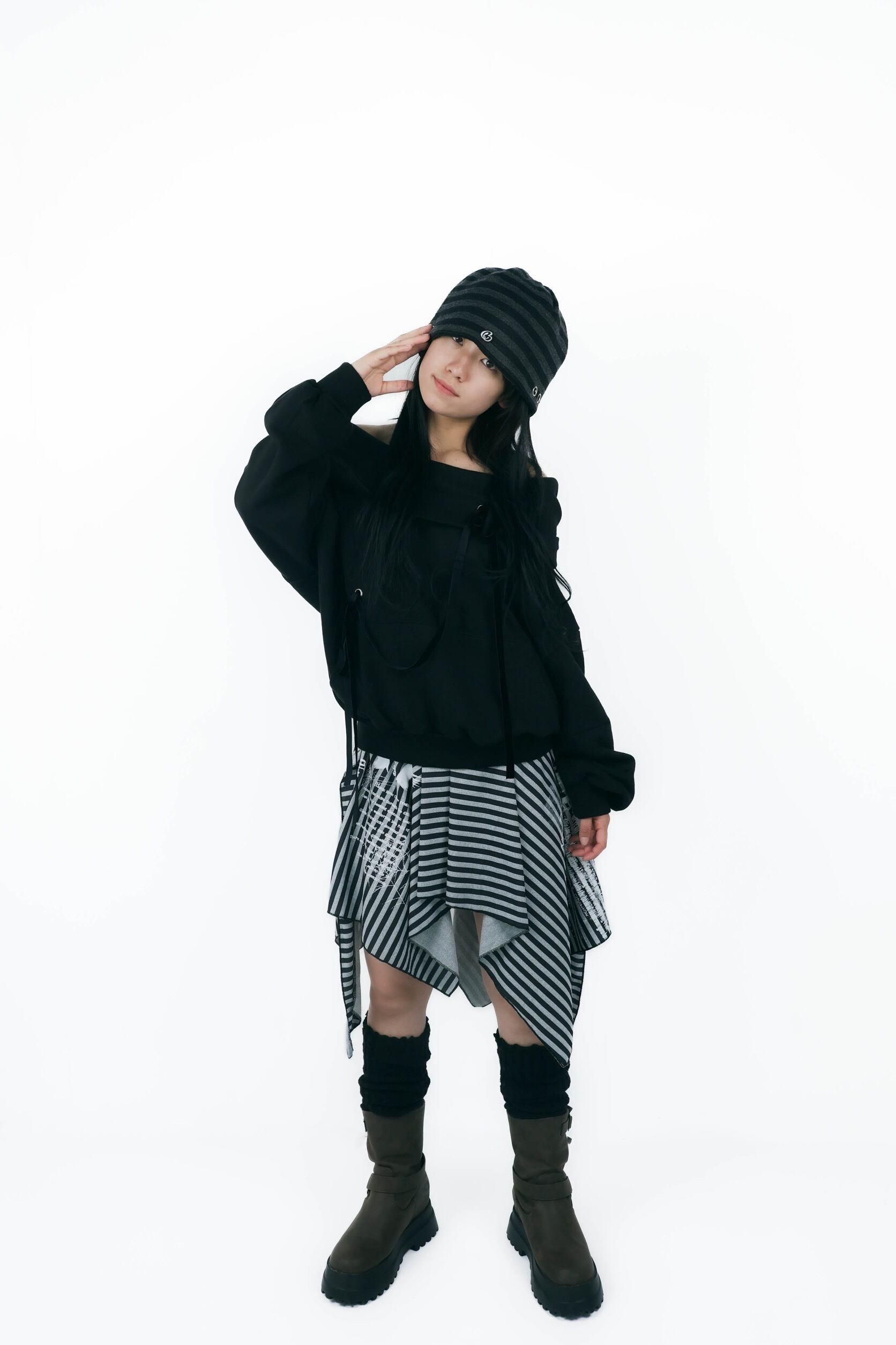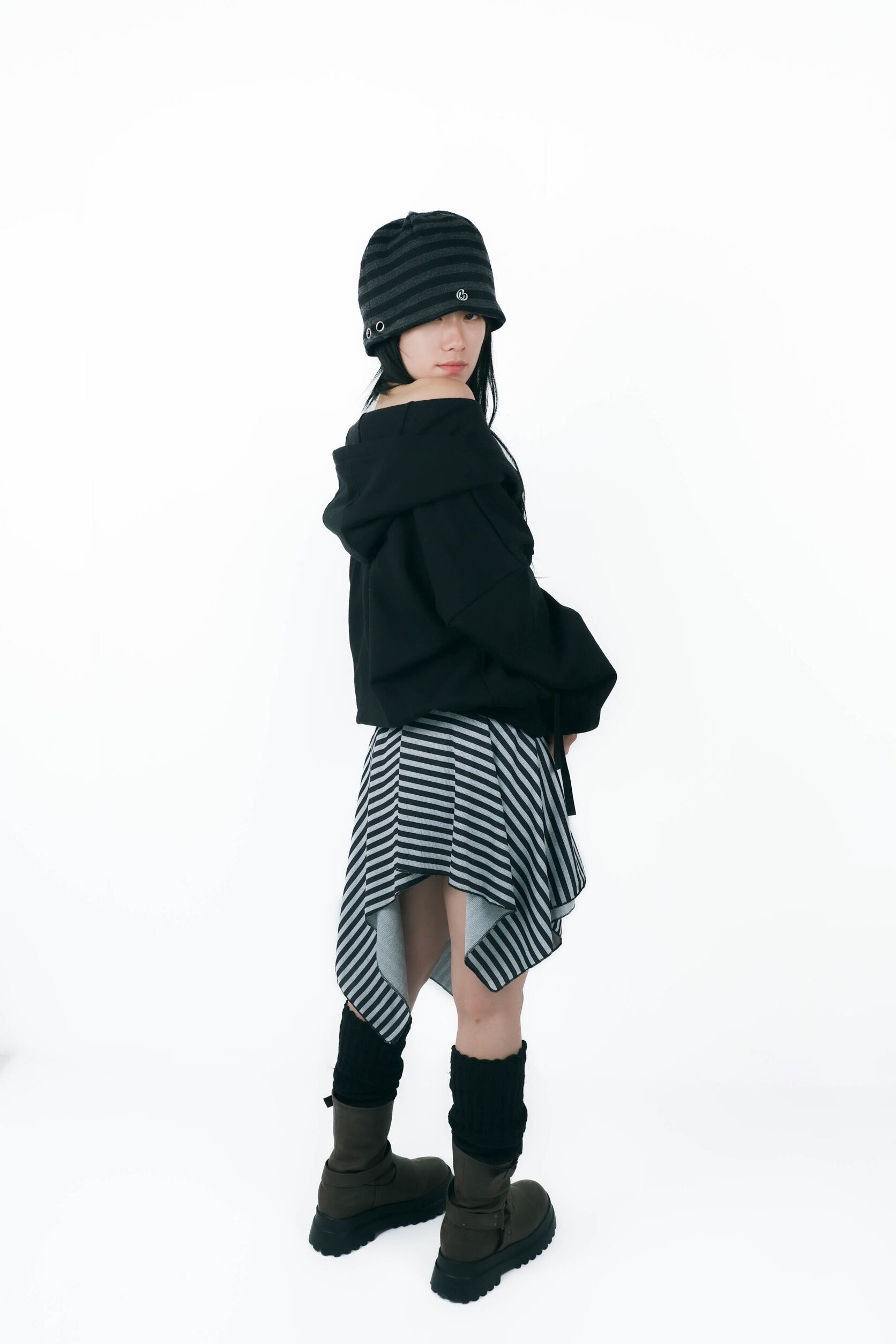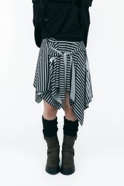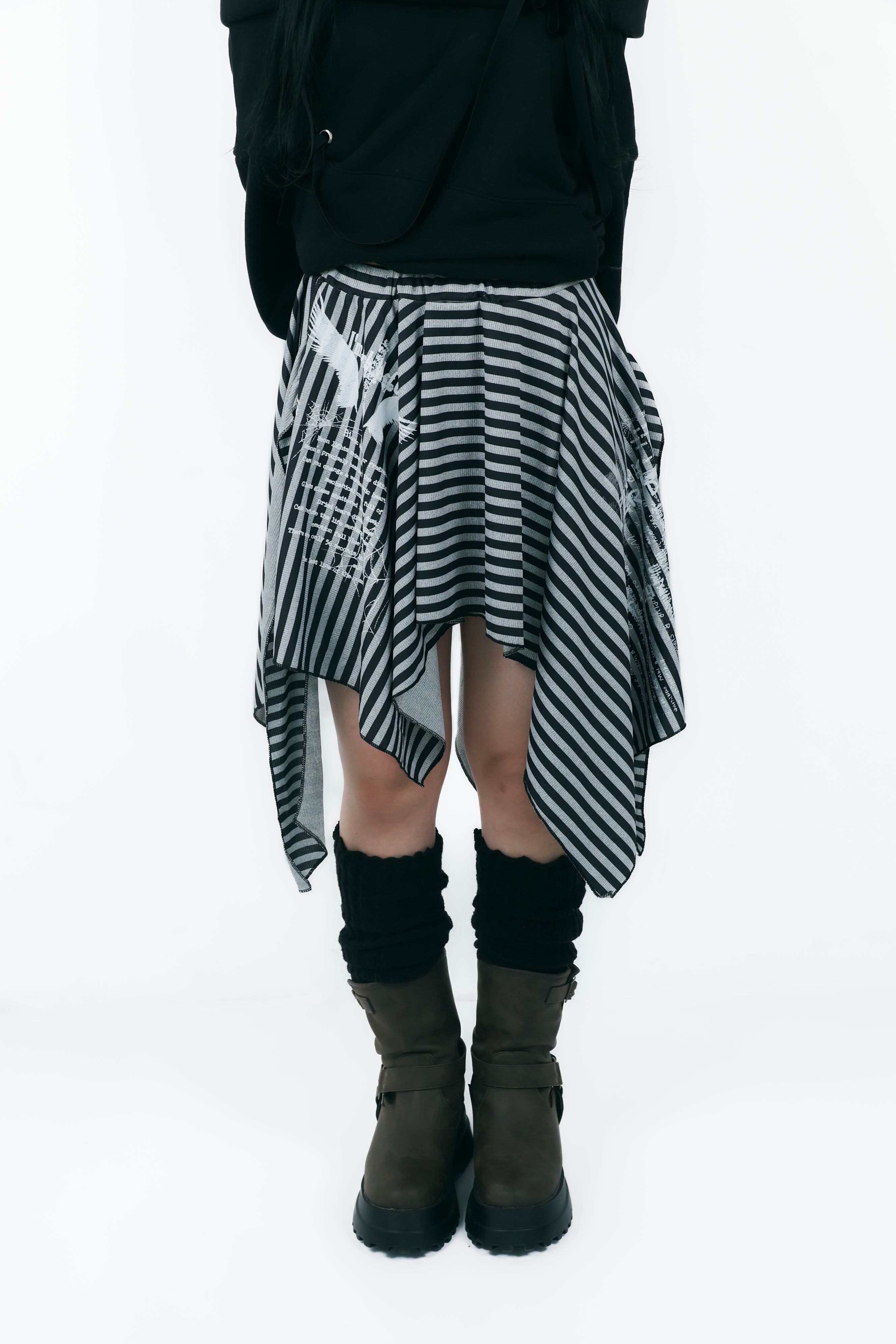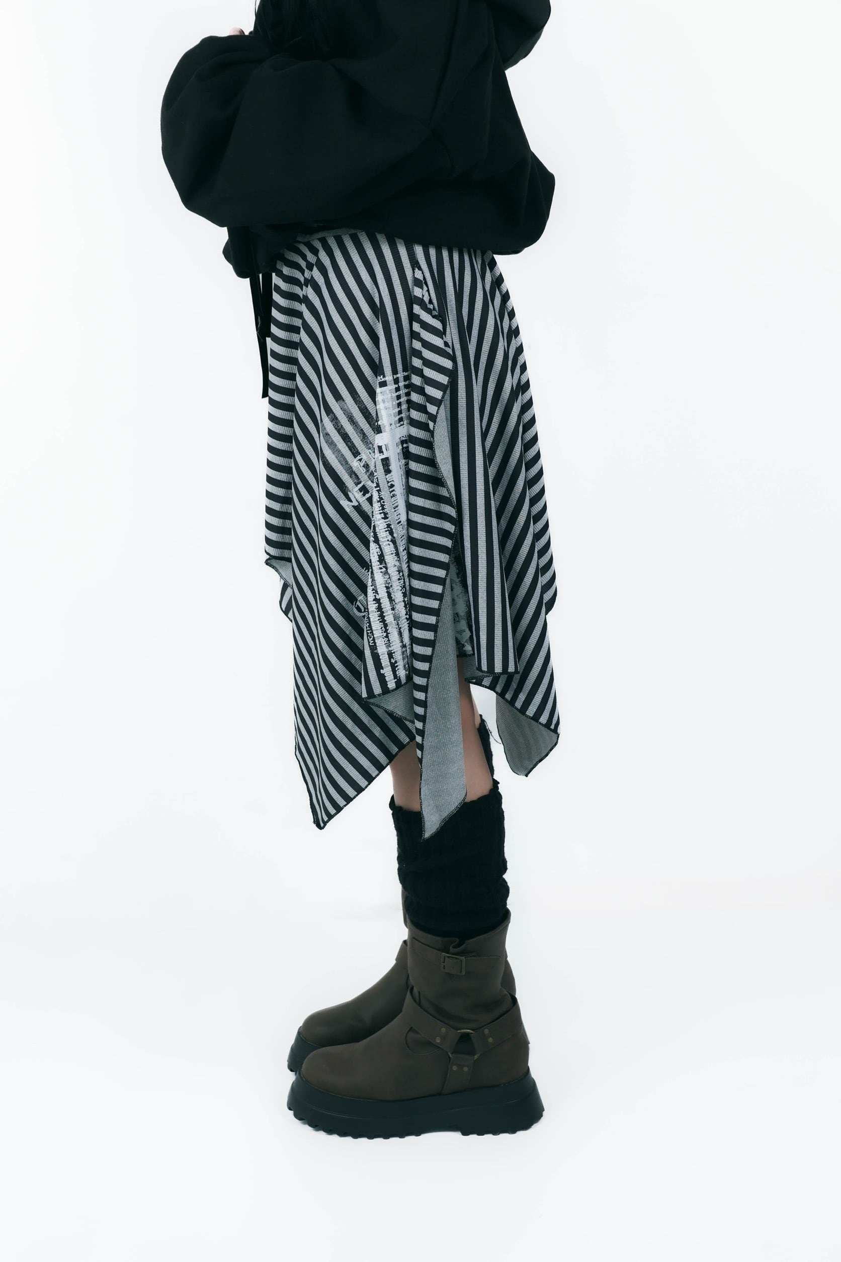 アシンメトリーな裾ラインとストライプ柄が視線を惹きつけるスカート。