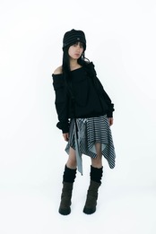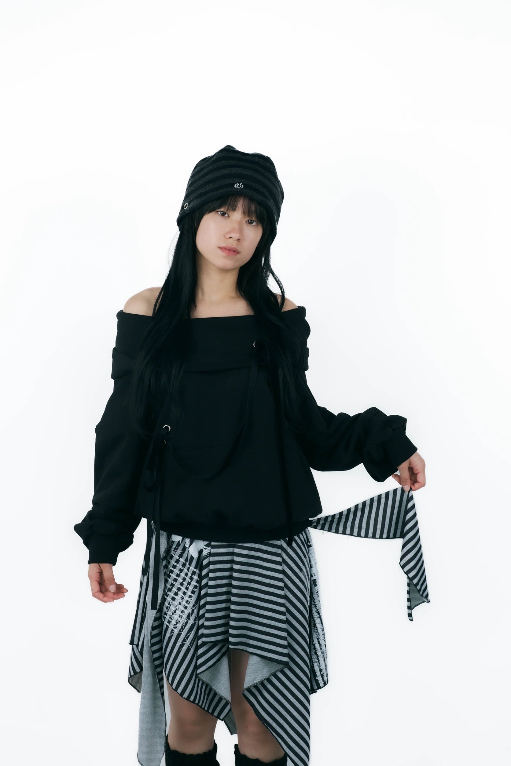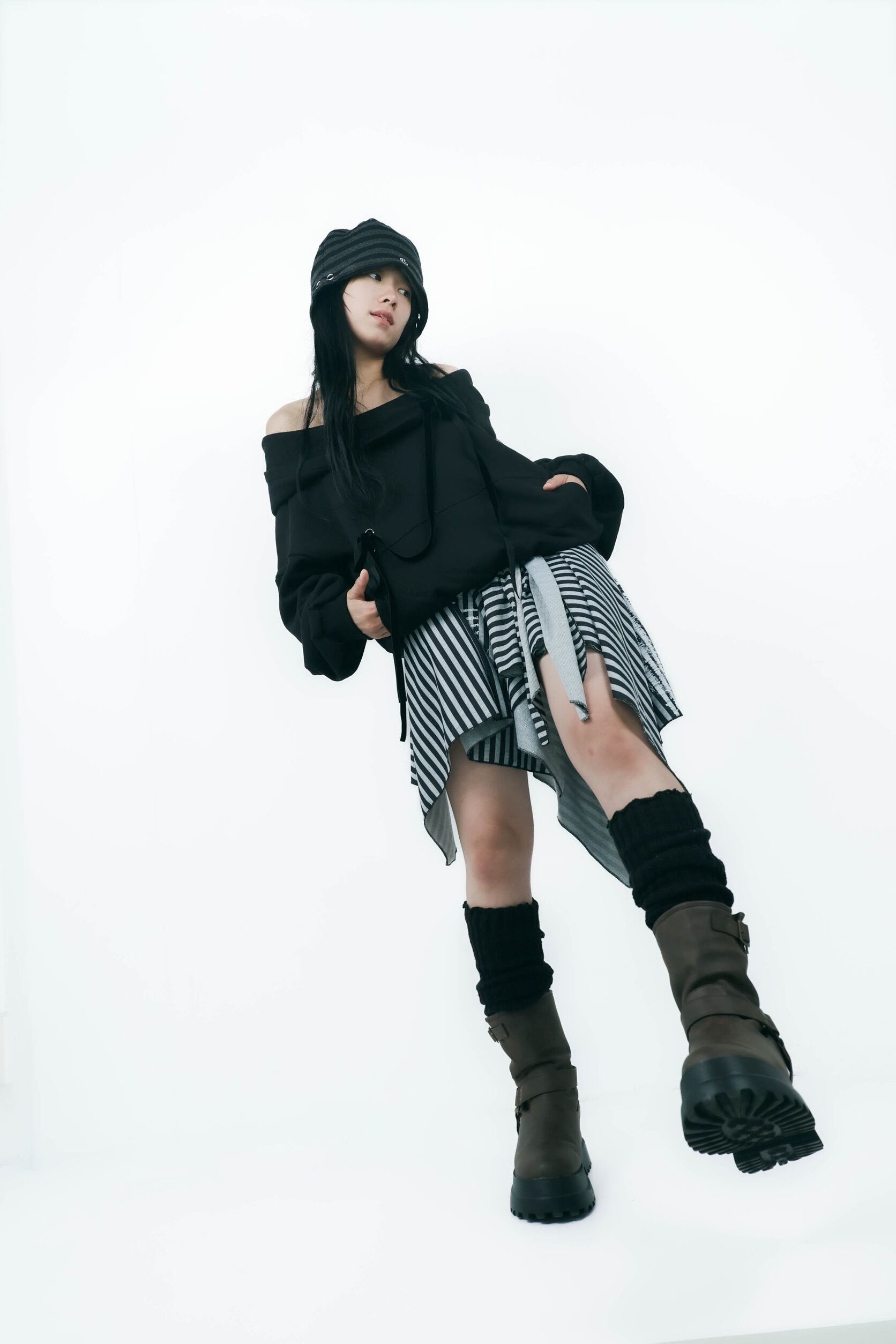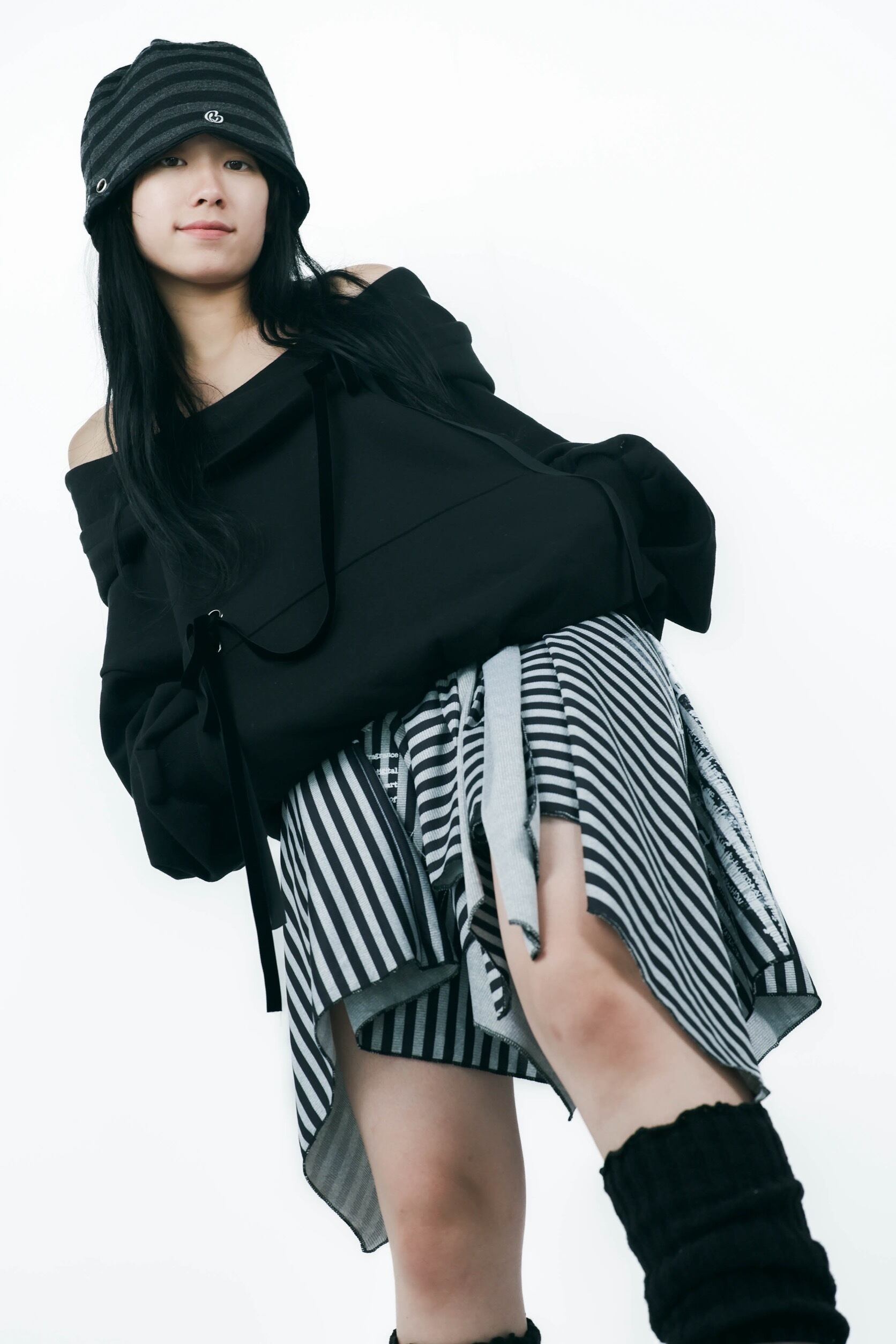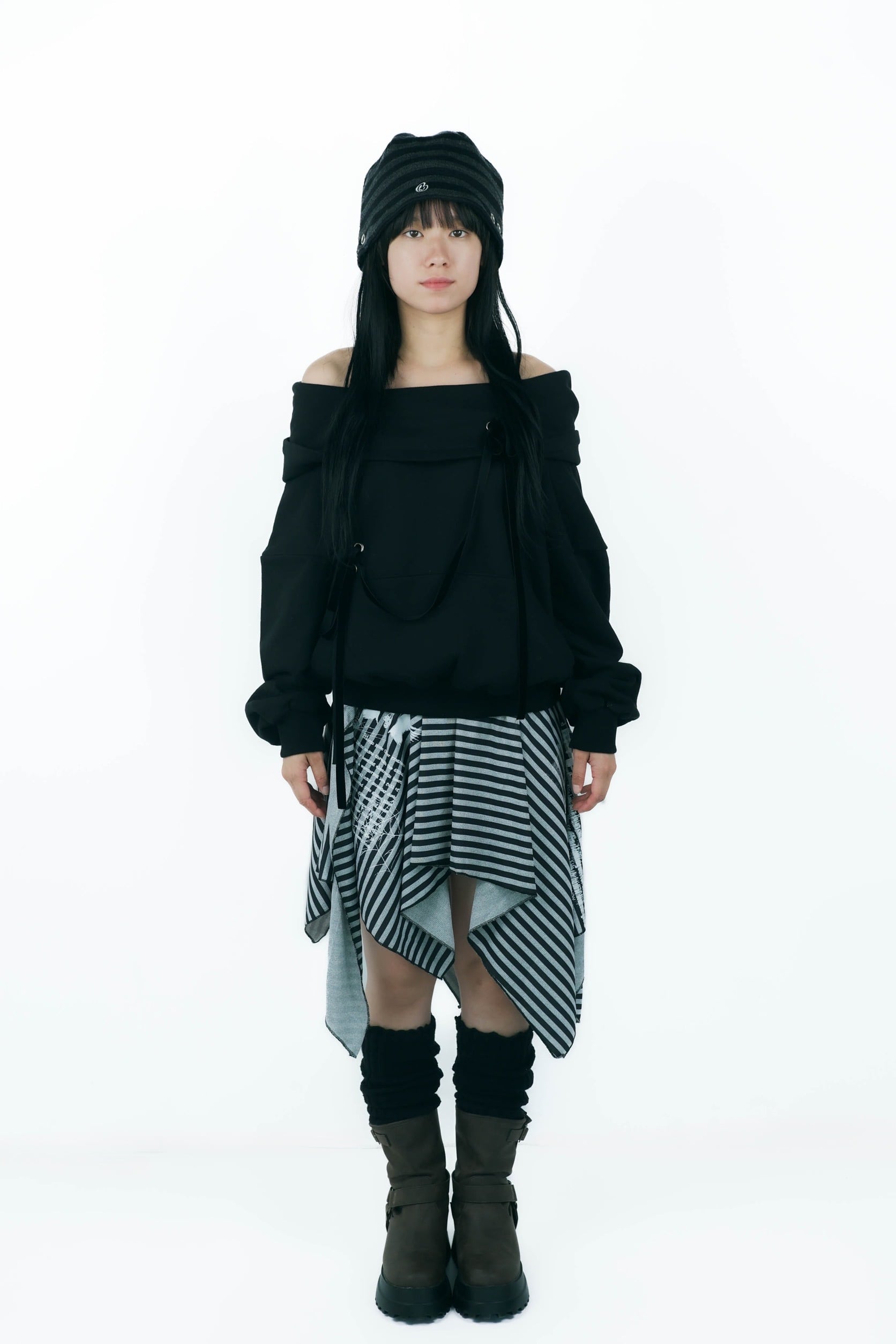 アシンメトリーな裾ラインとストライプ柄が視線を惹きつけるスカート。