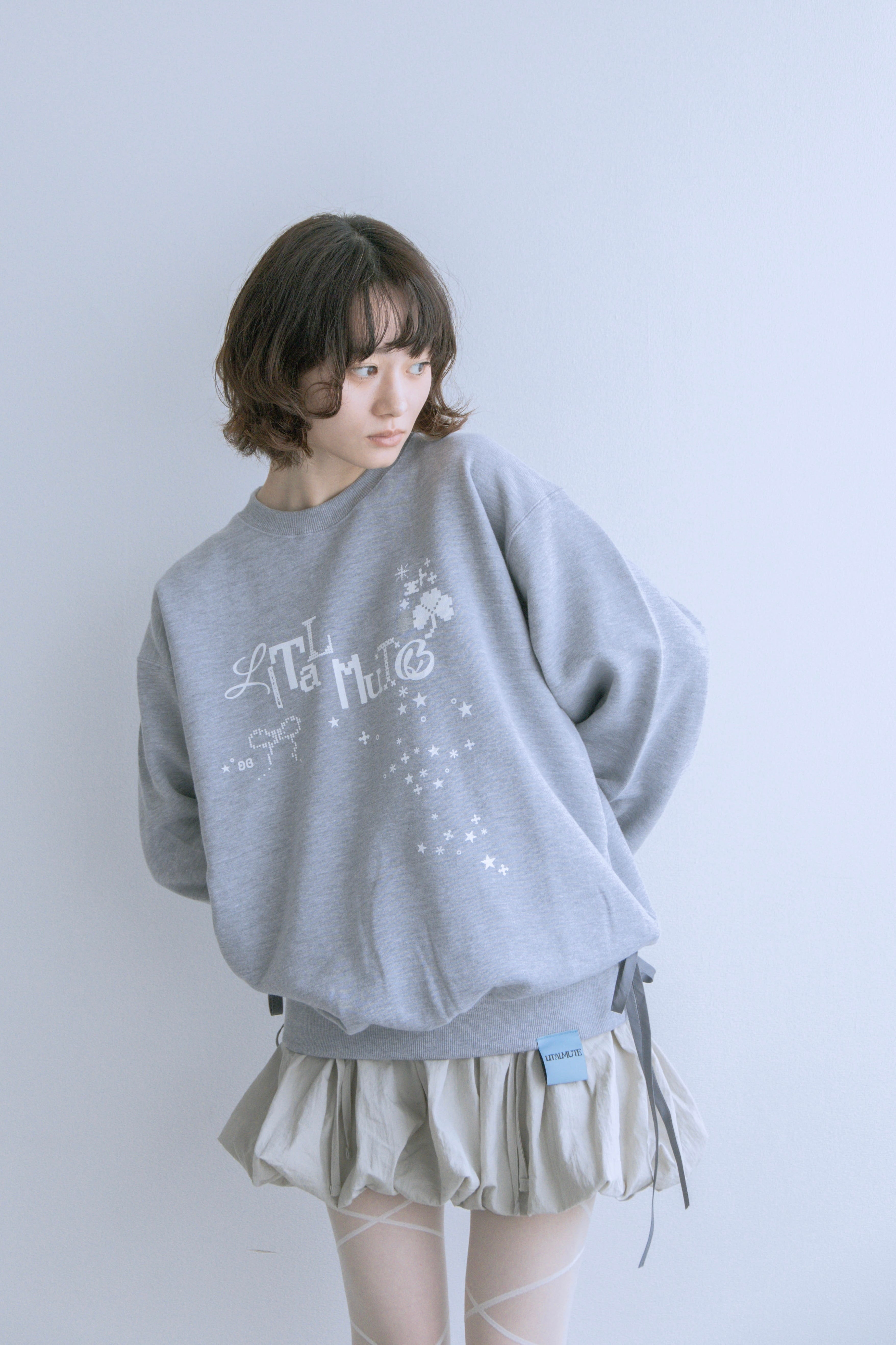 絵文字風ロゴがかわいいスウェット໒꒱· ゚サイドのリボンと裾のブランドタグが一癖あって、カジュアルスタイルに遊び心を加えます。少したまる袖と程よく絞まる裾が女の子らしいシルエットになります。